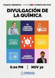En este evento conversaremos sobre la importancia de la divulgación de la química y por qué se necesita fortalecer este tipo de trabajo en Colombia y sus regiones. Nos centraremos en los diferentes modos de promoción y motivación de la química para el público general y en algunas estrategias que Andrea ha utilizado en la divulgación de la química en contextos educativos.