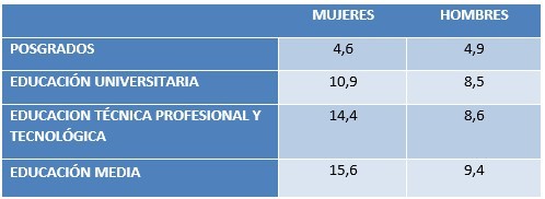 En lo relacionado al sector laboral, se revisó la situación actual de los profesionales a nivel nacional y su relación con el nivel de formación alcanzado. El DANE, en su boletín técnico más reciente sobre la Gran Encuesta Integrada de Hogares — Fuerza Laboral y Educación (Abril, 2018), pone en evidencia que la tasa de desempleo se reduce cuando se alcanza un nivel educativo mayor, comparado con el nivel de la educación media. Es de resaltar que, en el caso de las mujeres, esta tasa es mucho menor para quienes logran un nivel de posgrado, siendo este el único caso donde es menor que para los hombres (Tabla 1).